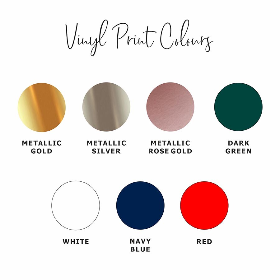 Print Colours: Metallic Gold | Metallic Silver | Metallic Rose Gold | Dark Green | White | Navy Blue | Red